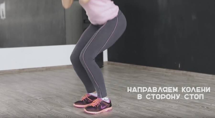 - Плавно приседаем, продавливая пол пятками.