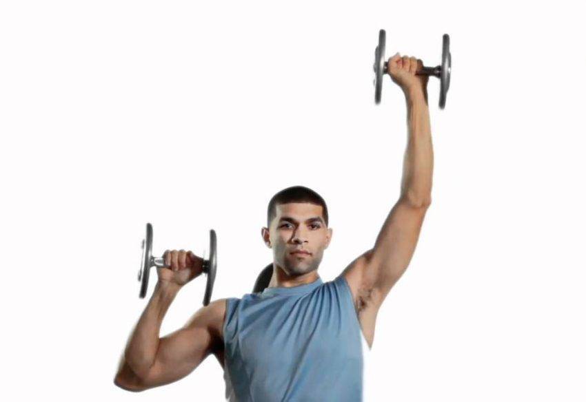 Движение начинается снизу. Ладони с гантелями расположены на ширине плеч. Движение вверх производится с выдохом за счет напряжения дельтовидных мышц