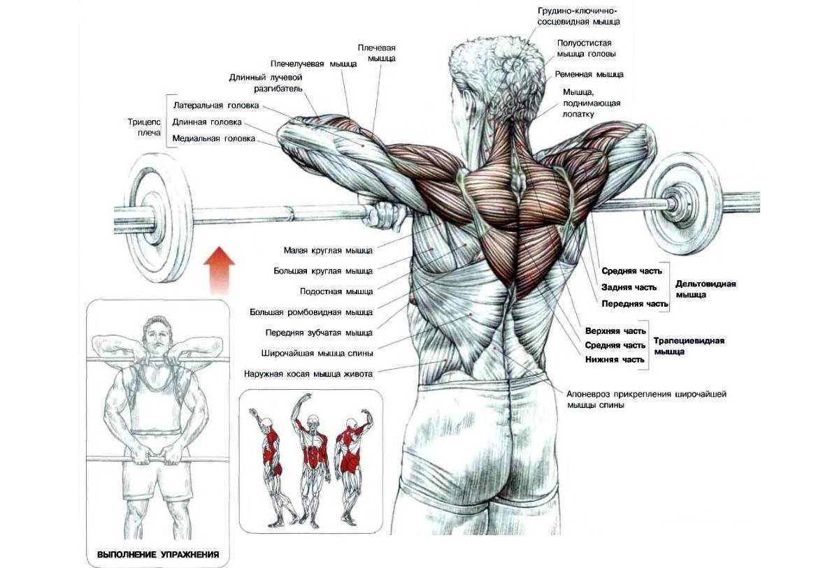 Помимо основных мышц в работе участвуют ромбовидные и двуглавые мышцы плеча.