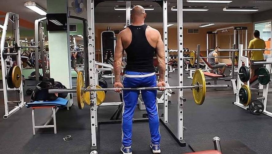 - Берется за гриф прямым хватом (ладони смотрят назад) чуть шире плеч.