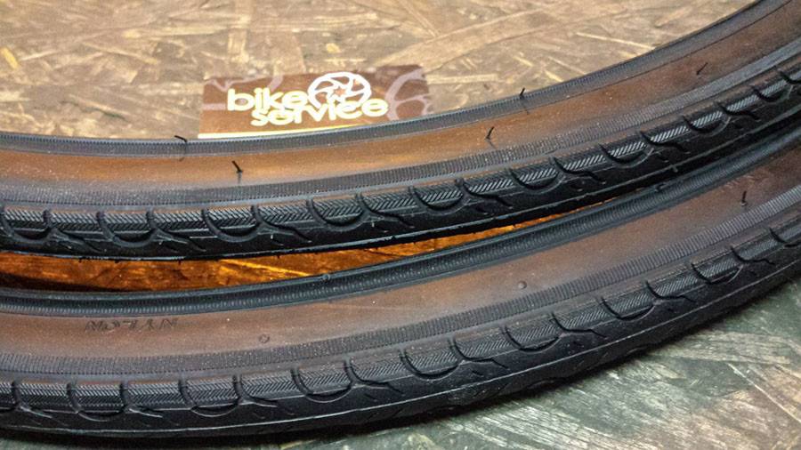 - Покрышки. От времени резина наверняка покрылась трещинами и рассохлась. Даже если на первый взгляд шины выглядят нормально, разойтись по швам они могут при первой же поездке на велосипеде. Единственным верным решением проблемы станет их замена.