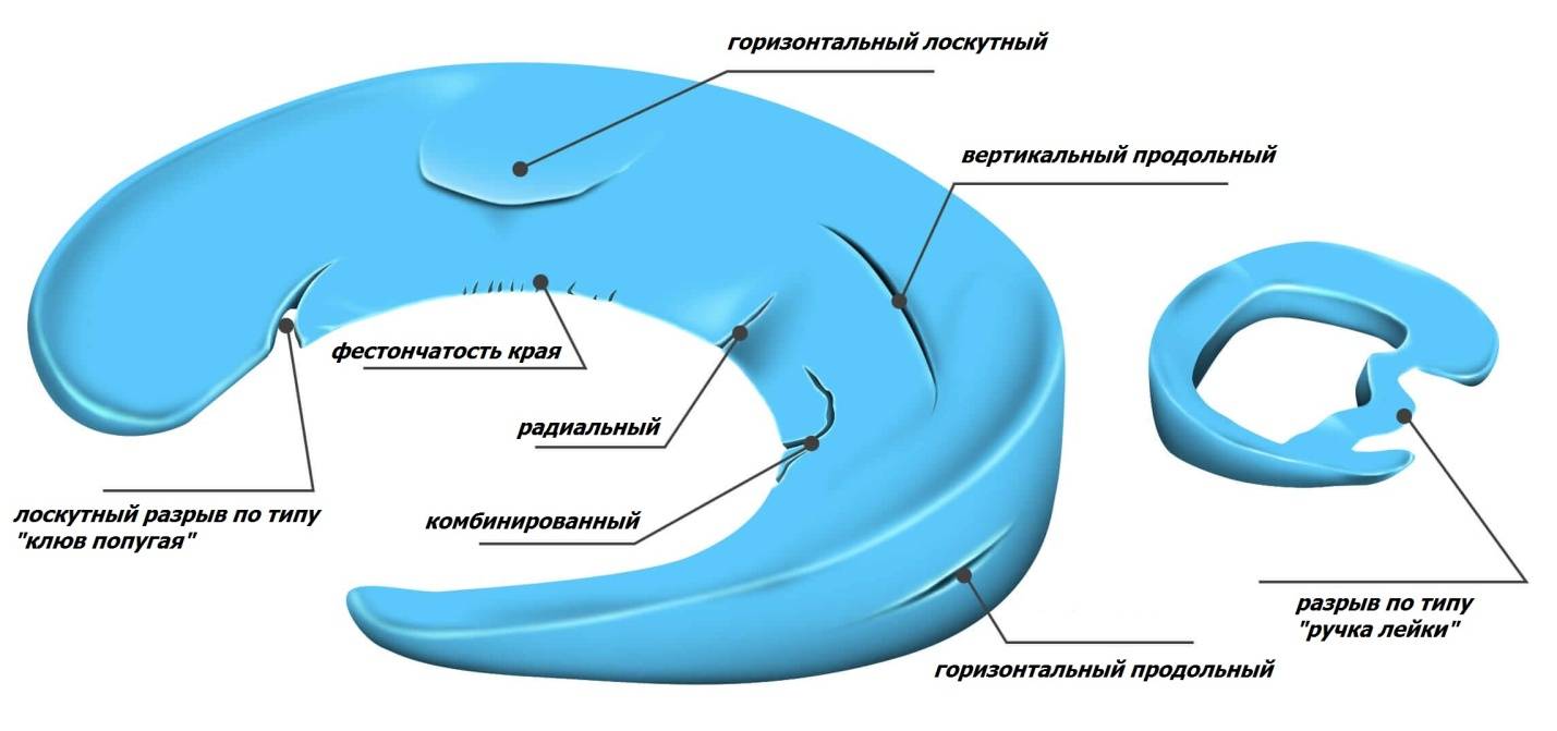 Виды разрывов достаточно разнообразны. Мениск может расслоиться, порваться вдоль или поперек, а также может быть комбинация повреждений. Оторванная часть мениска может смещаться при движениях и блокировать коленный сустав. Постоянное перемещение фрагмента мениска вызывает щелчки в суставе и хруст, сопровождаясь простреливающей болью. При стабильных разрывах без смещения фрагмента боль в суставе постоянная ноющая, усиливающаяся при физических нагрузках.