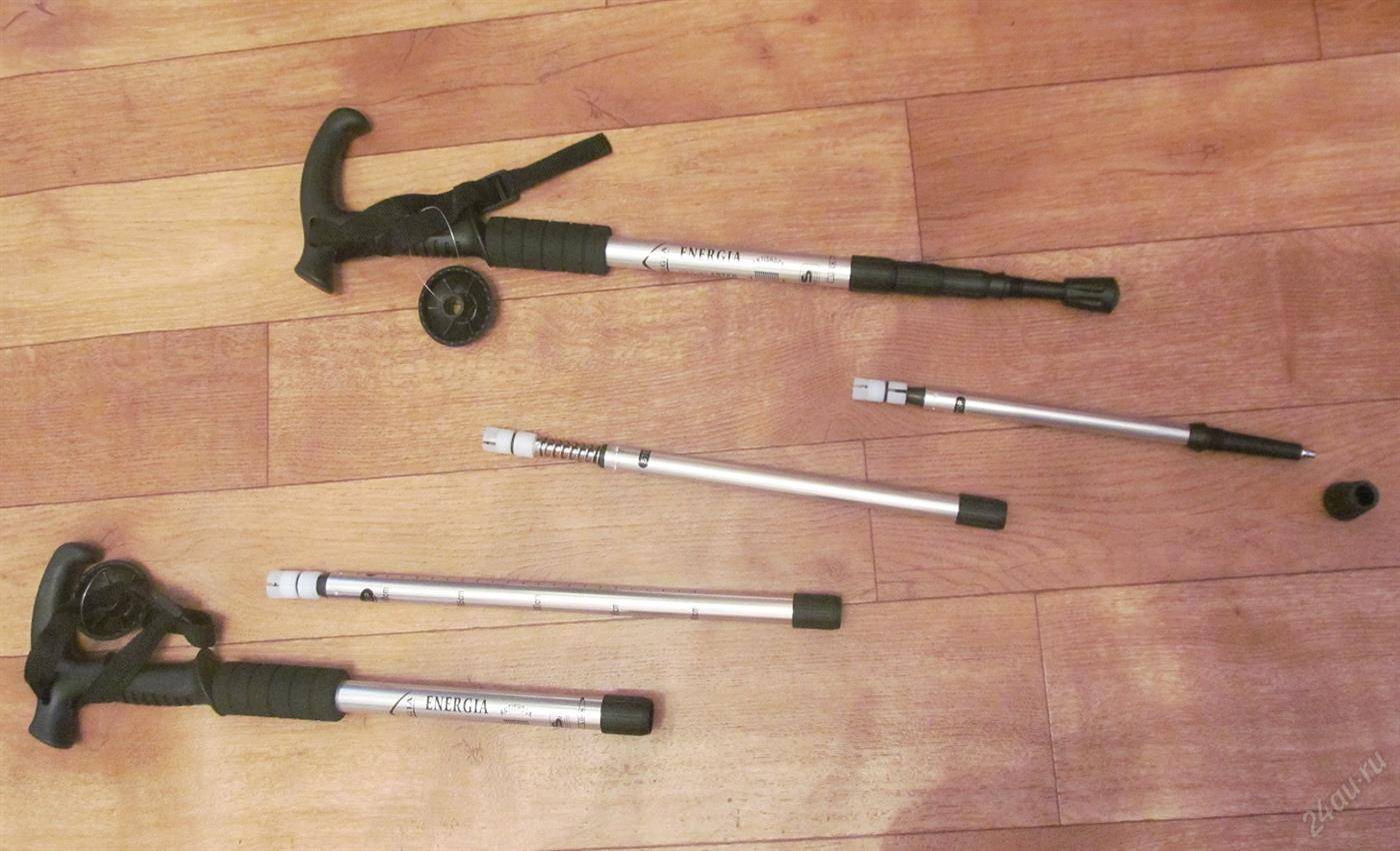 Секции складываются с помощью специального шнура, либо пластиковой трубки. Преимущества подобной конструкции в малом весе (от 250 до 350 грамм) и малых габаритах в собранном виде (35-40 см). Однако они плохо зарекомендовали себя в туристическом обществе, так как ряд моделей не могут изменять свою длину, подстраиваться под местность. Не все складные палки фиксированной длины! К примеру, модель Micro Vario (на фотографии выше) изменяет длину от 110 до 130 см.