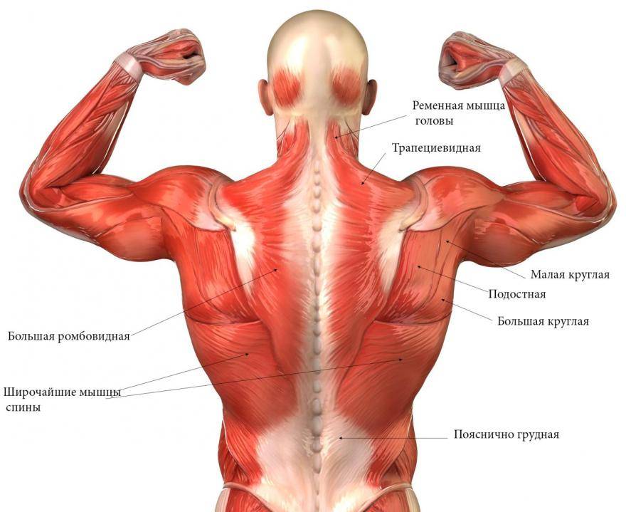 Самыми большими мускулами области являются: широчайшая и трапециевидная. Они необходимы для совершения различных тяг, и являются антагонистами грудной зоны, которые в основном толкают.