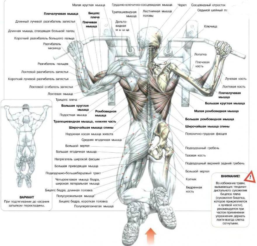 Следующее упражнение выполняется главным образом для нагрузки на «трапеции» и широчайшие мышечные ткани спины, также в ходе выполнения задействуются бицепсы и задние дельтовидные мышцы.