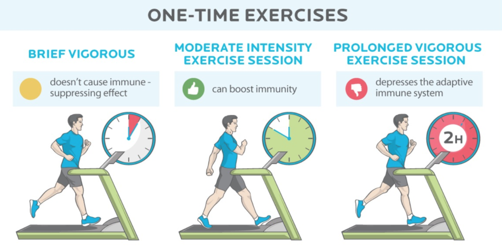 Короткая интенсивная тренировка не принесет пользы, благотворнее всего для иммунитета – тренировка средней продолжительности (40-50 минут) и низкой или средней интенсивности, ухудшает состояние и плохо влияет на иммунитет – продолжительная тренировка с высокой нагрузкой.