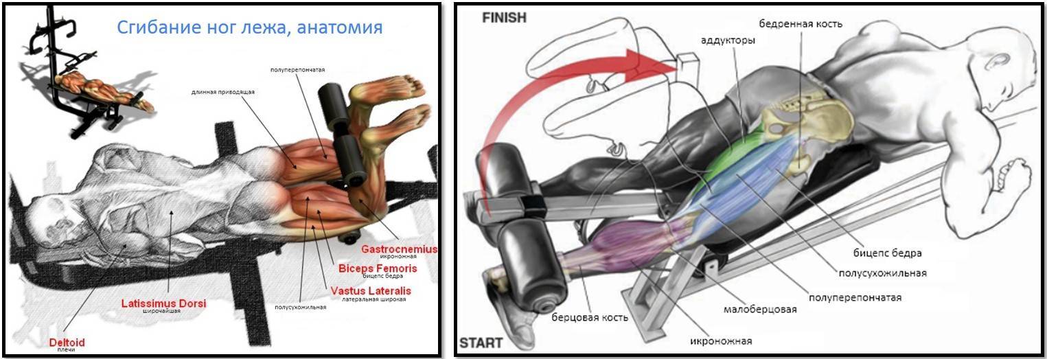 Движущая сила, при сгибании ног лежа (таргенируемой) — бицепс бедра, мускулы полусухожильные и полуперепончатые. Нагрузка изолированная направлена на бицепс и мускулы, отвечающие за сгибания коленей. Составляют подколенные сухожилия три мышцы: подколенная, перепончатая и полусухожильная. Первая из них относится к внешней мышце бедра. Она имеет две головки, одна из которых крепится к тазу, пересекая тазобедренный сустав, вторая прикреплена к бедренной кости. Две оставшихся, образуют внутреннюю заднюю часть бедра. Они также пролегают через весь тазобедренный сустав.