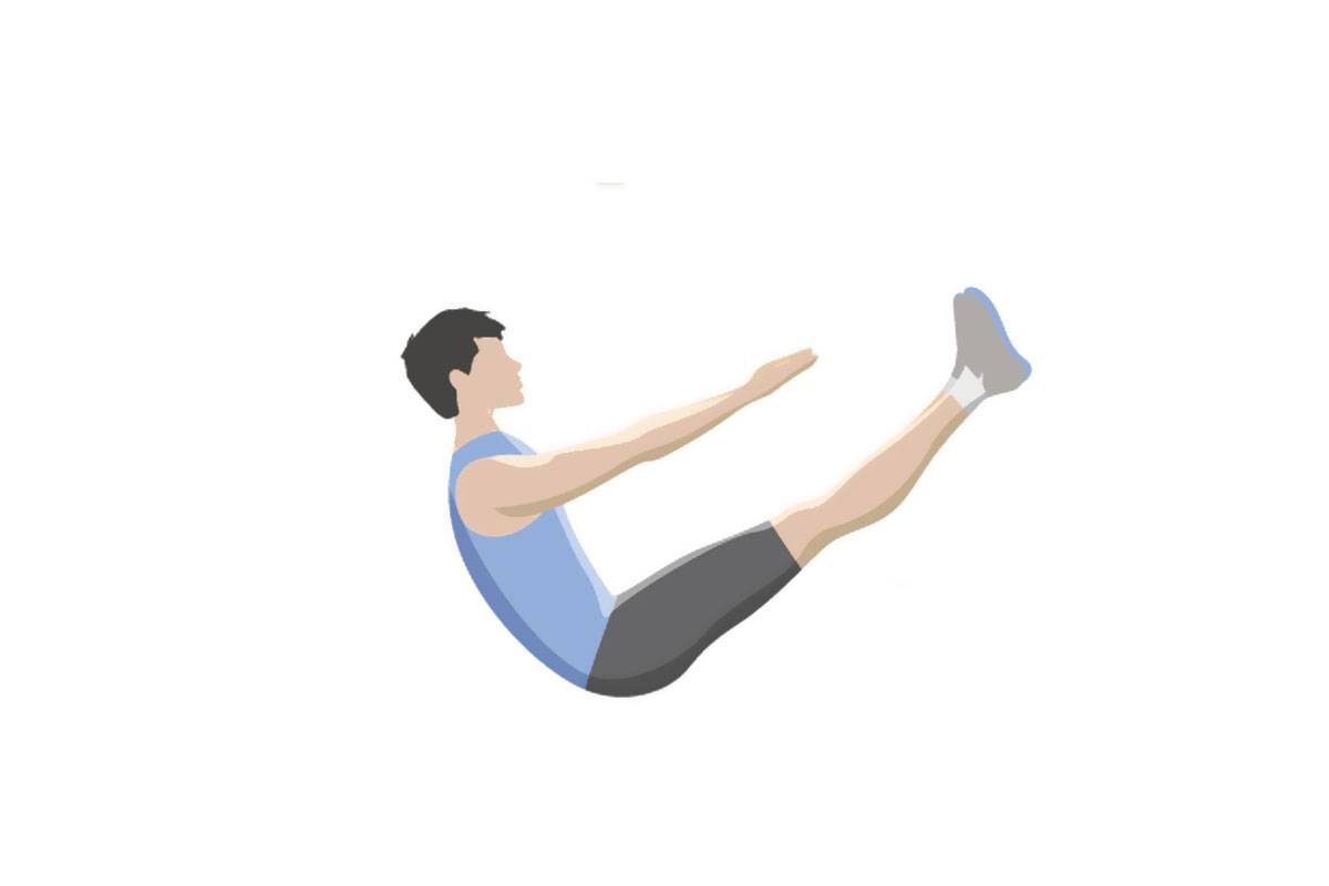 Упражнение продвинутого уровня. Исходное положение — лежа на спине, руки и ноги вытянуты. На выдохе, за счет силы мышц живота, поднимите прямые ноги вверх, одновременно поднимая и корпус с вытянутыми руками. Задержитесь в верхней точке на 1-2 секунды, затем повторите.