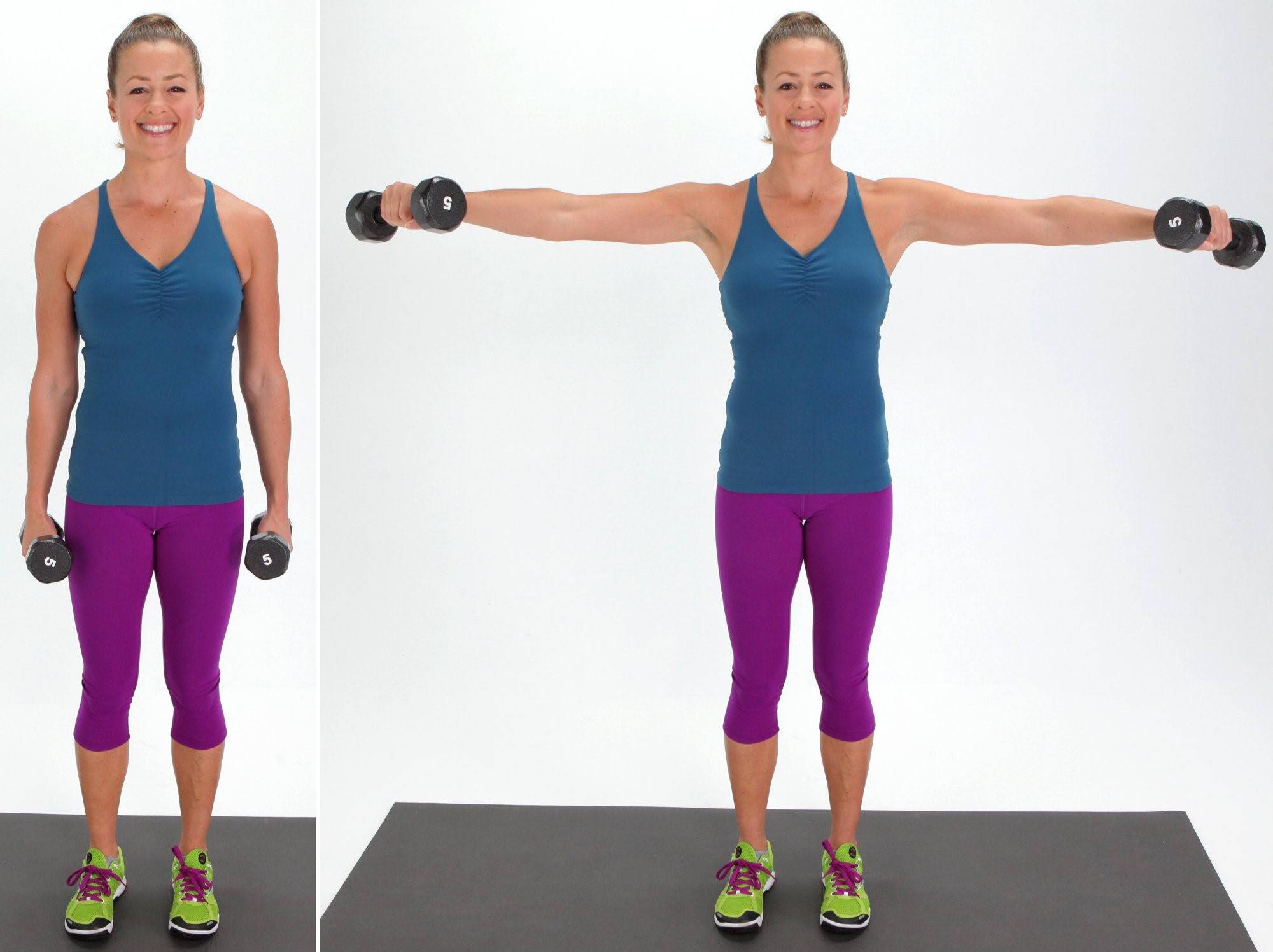 №1: подъем гантелей. Встаньте прямо, руки с гантелями вытянуты по швам. Поднимайте прямые руки вверх, доводя их до одной линии с телом. И затем опускайте обратно. Движение выполняйте медленно, без резких рывков. Двигаются только руки – тело зафиксировано на месте. Сделайте упражнение 10 раз.