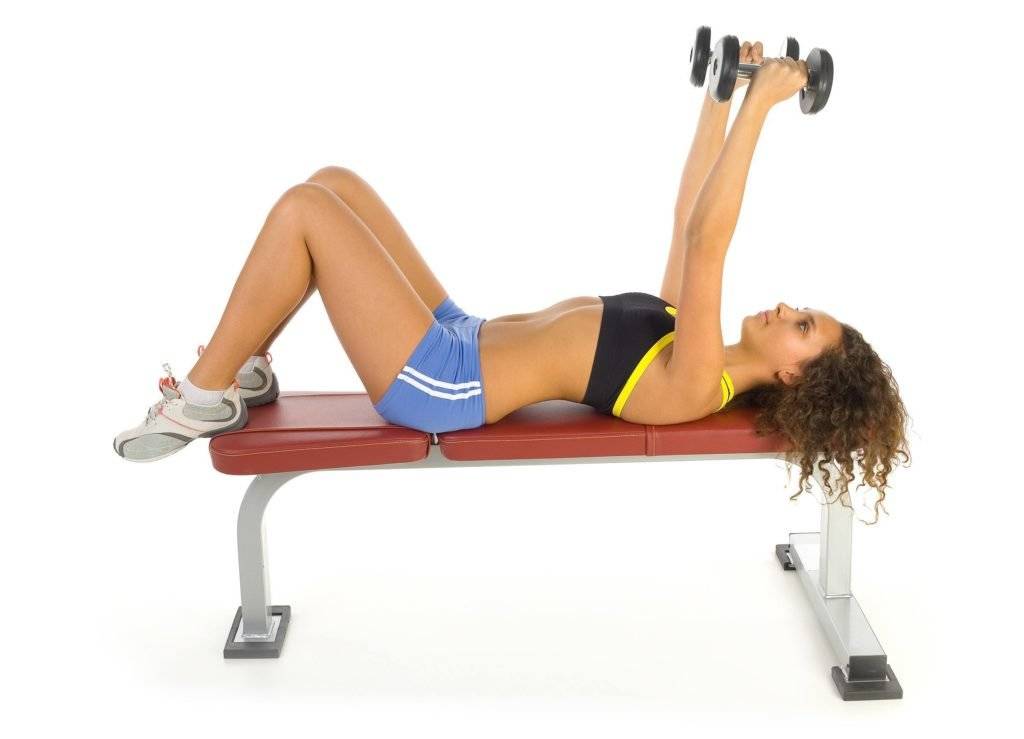 №2: пуловер лежа. Лягте на спину на твердую поверхность, расположив выпрямленные руки с гантелями над головой. Напрягая грудные мышцы, переводите прямые руки вверх – так, чтобы они оказались перпендикулярно полу. Затем снова опустите руки на пол за голову и расслабьтесь. Выполните движение еще 6 раз.