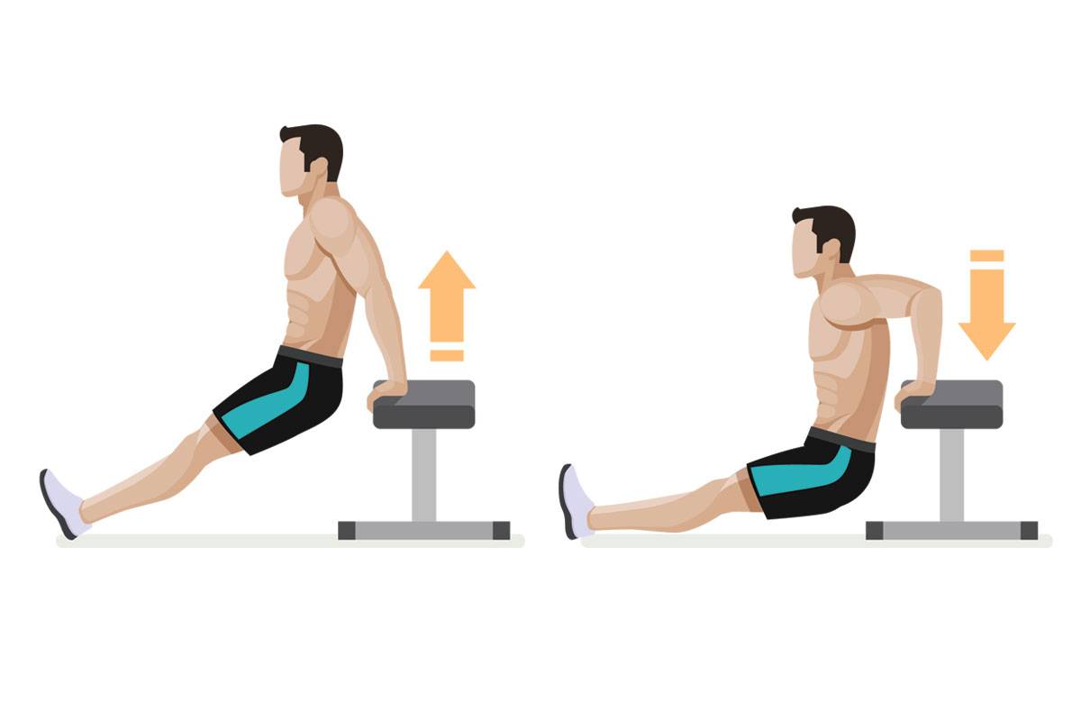 Упражнение для укрепления мышц трицепса, предплечий и плечевого пояса. В верхней точке словно выталкивайте вес тела вверх, над поверхностью скамьи или стула. Повторите 12-15 раз в медленном темпе. Жжение в мышцах трицепса — показатель эффективности техники.