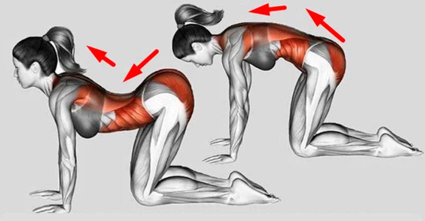 - встаньте на четвереньки, ладони под плечами, колени под тазовыми косточками. Оттолкнитесь от пола голенями и ладонями, и на выдохе толкните грудной отдел вверх;