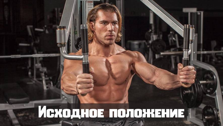 - Отрегулируйте высоту сиденья, так чтобы ваши руки сводились в центре грудных. А предплечье находилось на одном уровне с дельтами. Локти должны смотреть в стороны. Если у вас тренажер с упорами для предплечий. Тогда ориентируйтесь по положению локтей. И смотреть они уже будут не в стороны, а вниз.