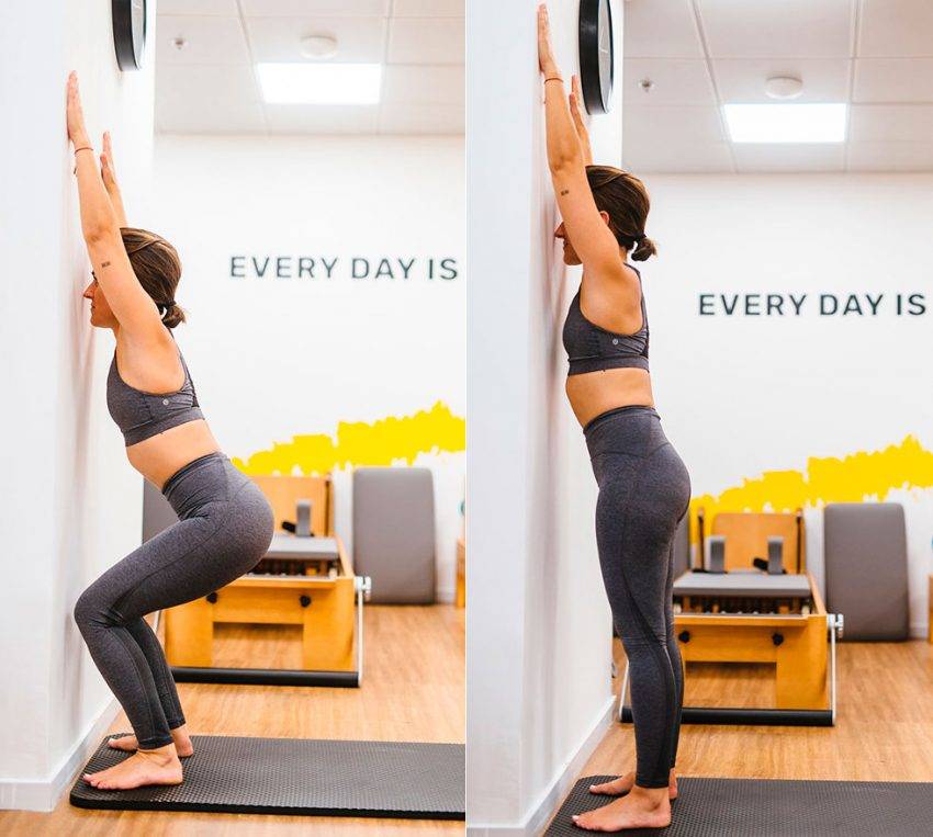 - Станьте близко к стене (желательно без плинтуса), пятки прижмите, стопы держите ровно (лучше выполнять тренировку босиком) на расстоянии плеч.