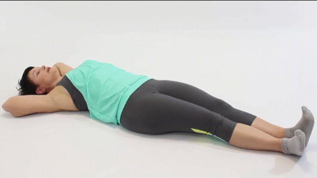 - Из положения лежа на спине, заложите руки за голову. Ноги при этом должны быть максимально вытянутыми, но не напряженными, а расслабленными.