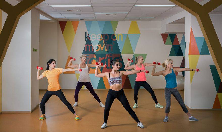 - Аэробные кардиоупражнения органично сочетаются с силовыми элементами, нагрузкой гантелями, мячом.