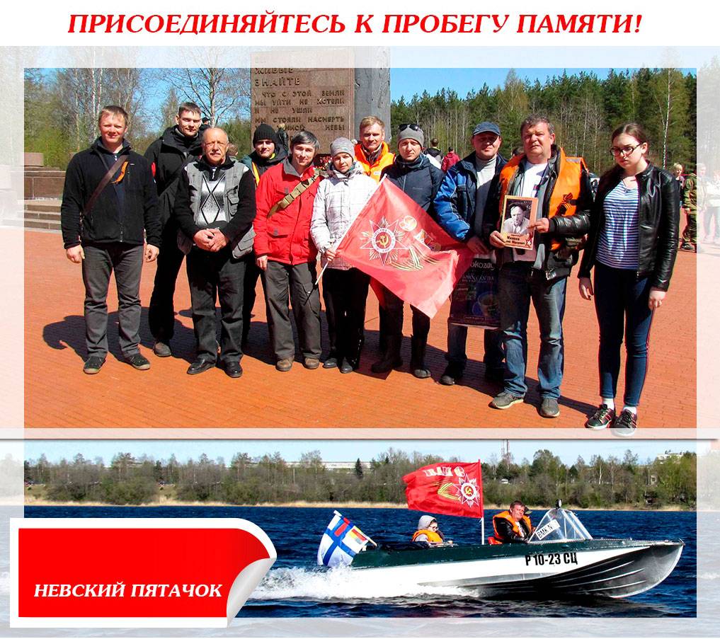 Ежегодный пробег памяти от клуба «ВМК №1» Петергоф (Ораниенбаумский плацдарм) до «Невского пятачка». Участвуют надувные лодки и катера.
