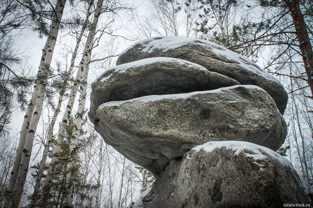 Здесь вы попадете на старую Таватуйскую дорогу. Идите по ней направо. Через километр влево, на горку, будет уходить зарастающая просека. По ней идет слабенькая тропка. Поверните туда. Местами встречаются ленточки, показывающие, куда нужно свернуть. Примерно через 700 метров нужно будет повернуть направо. Еще метров 300 – и будут скалы. Километраж от Мурзинки и обратно – 17 км.