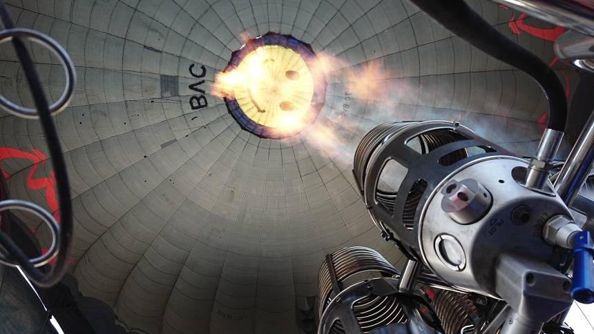 Главный орган управления тепловым аэростатом — это газовая горелка, расположенная под оболочкой и направленная вверх. В ней горит смесь пропана и бутана, которую берут на борт в баллонах, похожих на те, что стоят у многих дачников на кухне. При помощи огня нагревается воздух в оболочке; температура растет, шар поднимается. В зависимости от объема оболочки (2-5 тыс. куб. метров воздуха), полезной загрузки и температуры окружающего воздуха температура внутри составляет 50-130 градусов Цельсия. Воздух в оболочке постоянно остывает и шар начинает снижаться, поэтому нужно периодически «поддавать жару» для сохранения постоянной высоты. В общем, все просто: больше огня — поднимаемся, меньше огня — сохраняем высоту, мало-мало-мало-мало-мало огня — снижаемся.