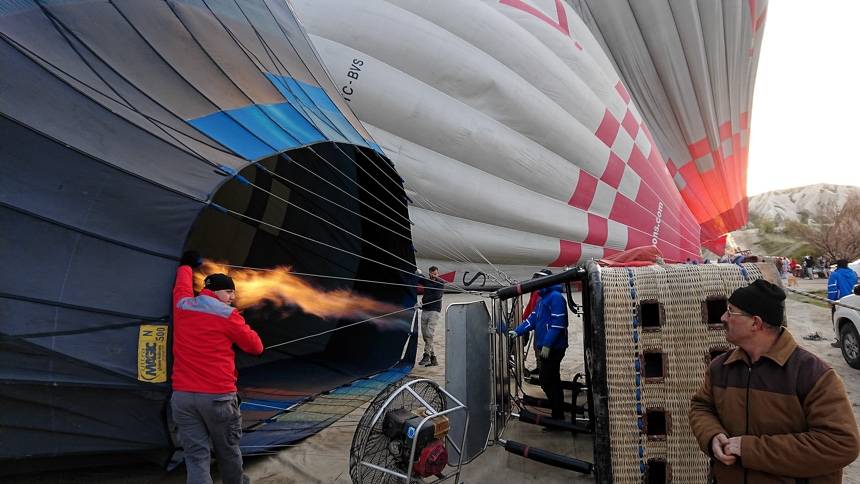 Сначала вас привозят к вашему воздушному шару. В этот момент он еще лежит на земле, корзина на боку, а при помощи мощного вентилятора оболочку наполняют воздухом, одновременно нагревая его горелкой. В какой-то момент обмякший шар становится упругим и взмывает ввысь. Корзину переворачивают, пассажиры садятся в нее, перелезая через борт. Внутри есть двухточечные ремни, которыми, впрочем, мало кто пользуется, а также веревки, за которые нужно будет держаться при посадке. Предполетный инструктаж, собственно, и заключается в том, что при посадке нужно обязательно присесть и держаться за веревки, поскольку велика вероятность опрокидывания корзины: это позволит избежать травм.