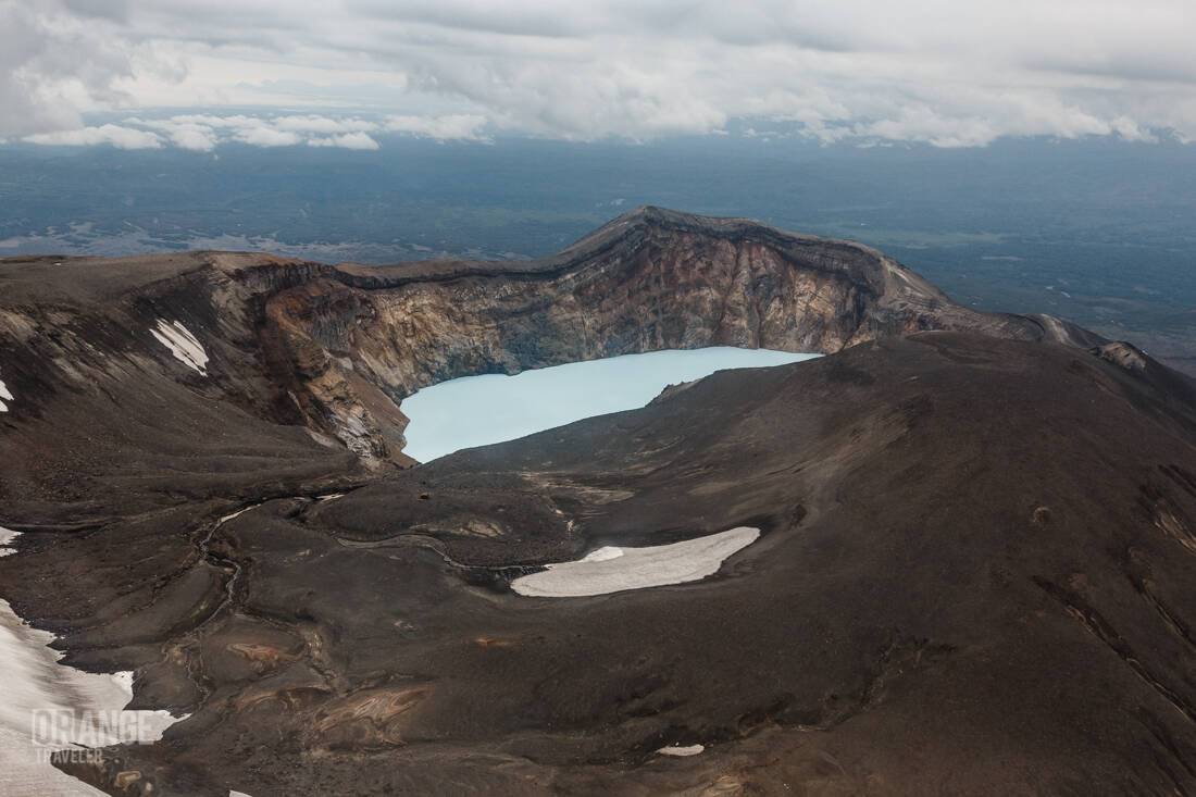 В семье, как говорится, не без «урода». Горелый внешне абсолютно ничем не примечателен. А вот его кальдера, размером 9х14 км с цепочкой из 11 кратеров, известна своими кислотными озерами нереального изумрудного цвета. Самый эффектный кратер — «Активный», именно в нем находится озеро, на склонах дымят фумаролы. Самый большой — «Голубое озеро». В воронке неправильной формы тоже есть озеро, в котором в начале лета плавают льдины. Находится в 114 км от Петропавловка-Камчатского.