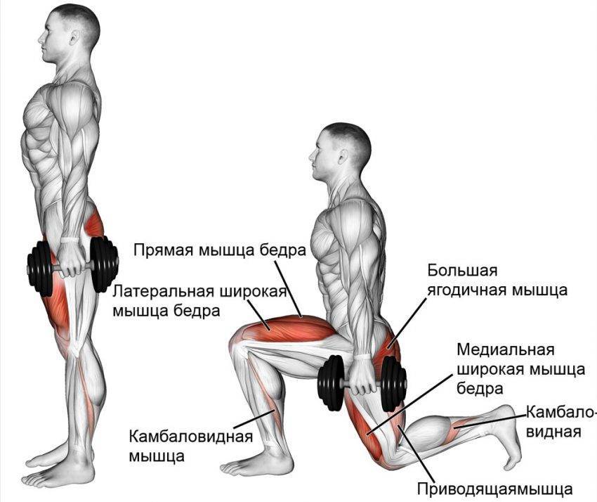 Это сложное многосуставное движение. В основном нагрузка приходится на переднюю и заднюю поверхность бедра и ягодичные. Мышцы торса работают как стабилизаторы, мышцы кора тоже. Руки удерживают гантели или штангу и работают в статике.