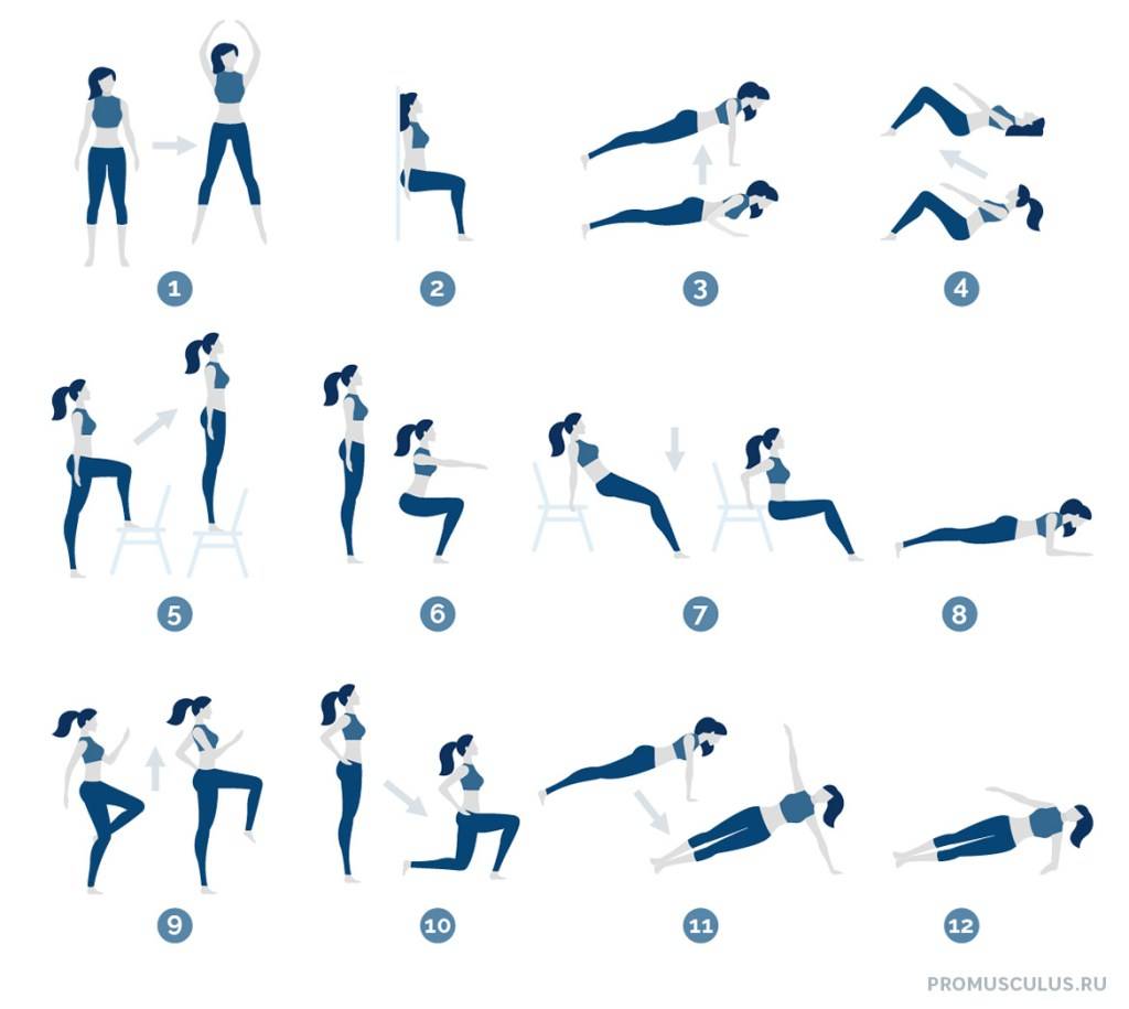 - Отдыхайте после каждого круга от 1 до 3 минут (но не отдыхайте между упражнениями).