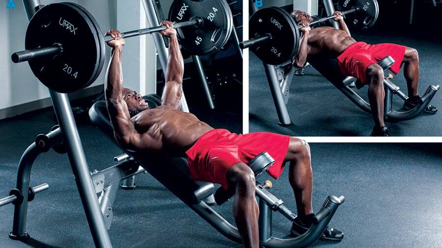 - На наклонной скамье — поднимать штангу таким способом полезно для проработки грудных мышц области ключиц, которые мало задействованы при обычном жиме лежа.