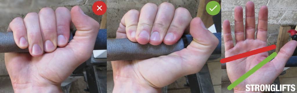 Многие недальновидные спортсмены понимают словосочетание «жим узким хватом» слишком буквально и ставит руки чуть ли не вплотную друг к другу. Так делать не следует, при такой узкой постановке рук Вы не сможете удерживать локти и корпуса. Оптимальная ширина – чуть уже уровня плеч, обычно это делается примерно на уровне внутреннего края насечек на грифе.