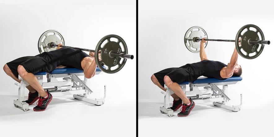 - Не отрывайте спину от скамьи, а стопы ног от пола. Не отбивайте гриф штанги от груди, выполняйте жим подконтрольно, максимально чувствуя напряжение в мышцах на всей траектории движения.