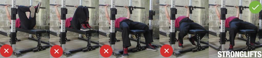 Ягодицы должны быть плотно прижаты к скамье на протяжении всего подхода. Отрывая их, Вы создаете нежелательную компрессию на межпозвонковые диски поясничного отдела позвоночника и теряете концентрацию на движении. Аналогичная ситуация и с затылком – его также не следует отрывать от скамьи.