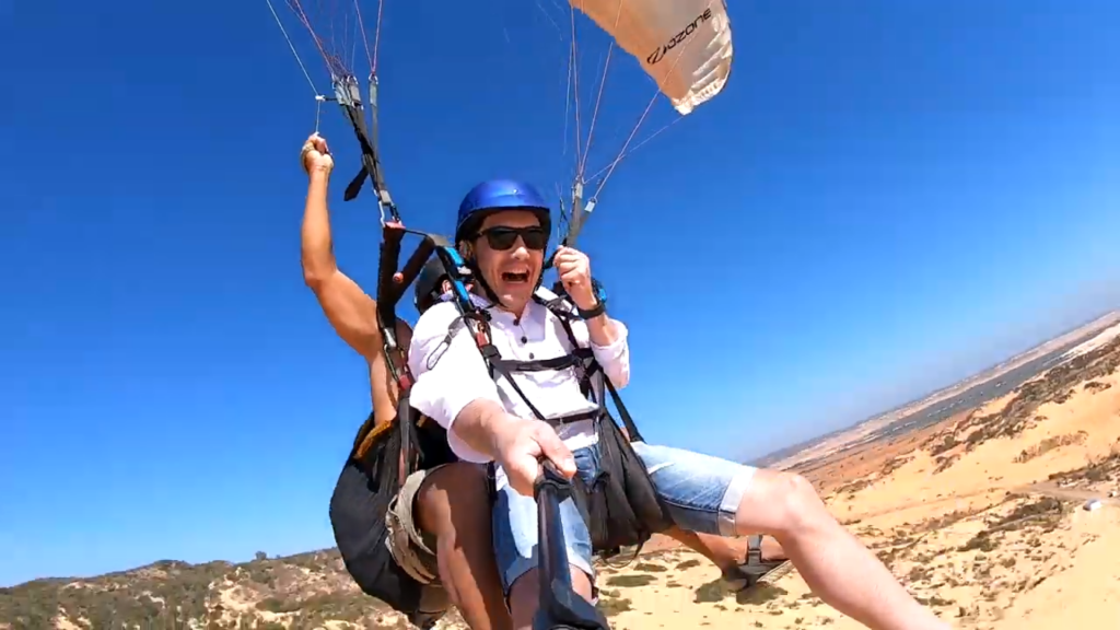 Пилот просит отцепиться от троса. Дергаете ручку отцепки и… Теперь вас с землей уже ни что не связывает. Вы в свободном полёте! Какая красота! А как забавно помахать руками и ногами в небе! Хотите просто посмотреть землю глазами птиц и полетать – пожалуйста, наслаждайтесь чувством полёта. А может хотите немного покачаться – опытный пилот продемонстрирует безопасный пилотаж.
