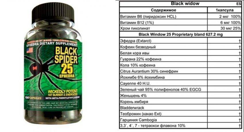 Вlack Spider 25 содержит имбирный корень, зеленый чай, кайенский перец — ингредиенты, образующие вместе термогенный комплекс. В состав жиросжигателя входят и витамины B, теобромин, который поднимает настроение, а также фенилэтиламин, являющийся прекурсором наркотических веществ, оборот которых ограничен на территории России. Последний факт может стать причиной проблем с законом, когда посылка с Блэк Спайдером приходит из-за рубежа.